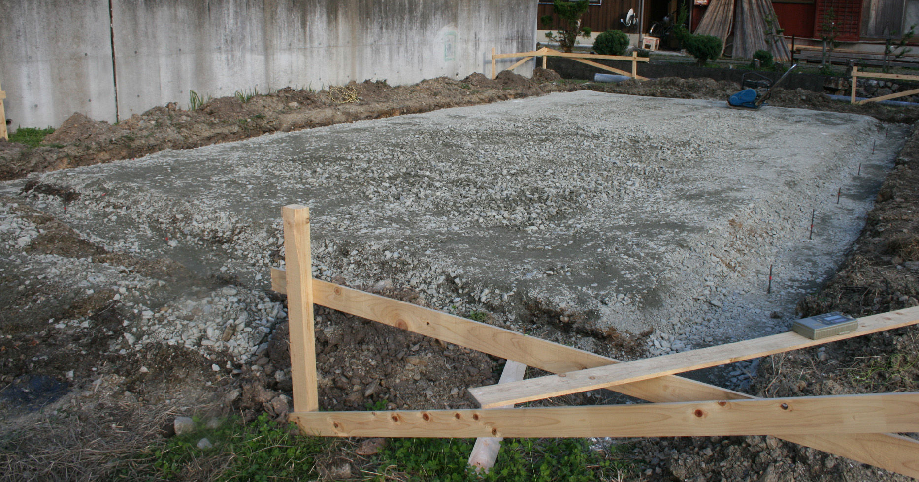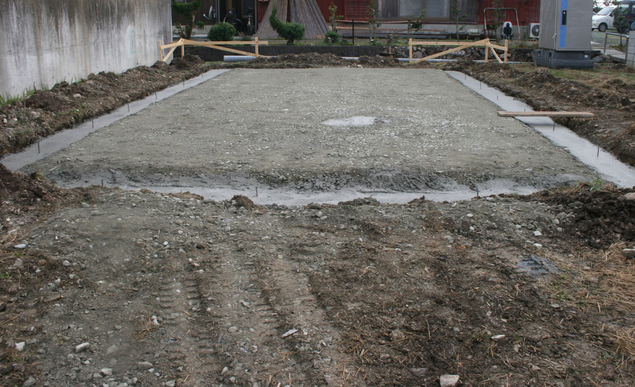 本日より、建設現場の様子をお伝えしていきますこちらの現場では、一戸建ての住宅が新築されます早速現場に出動すでに砕石が敷かれた状態ですここから、廻りのへこんでいる部分に生コンを流していきます捨てコンです生コンを運び、均していきながら順調にすすんでいたら、なんと!最後の部分で生コンが足りないというアクシデント発生幸い生コン会社が近くにあり事なきをえたのですが、ずっと現場にいるわけにも行かず一旦事務所に戻りましたですが、完成したところを撮りたいということで、翌日パチリ捨てコン完成です